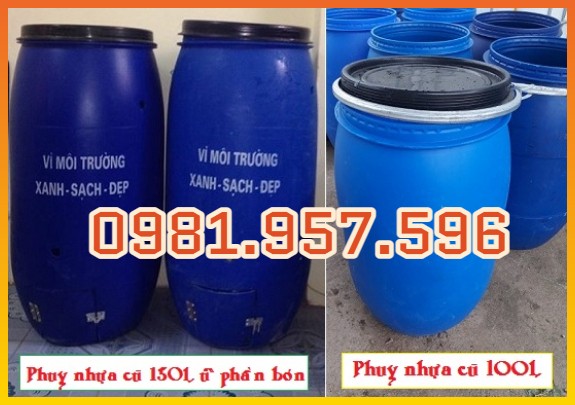 Thung phuy nhua cu, thung nhua hinh tru, phuy nhua tai che, phuy nhựa 100L tái chế, phuy 150L tái chế