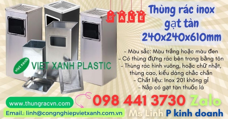 img mainimage src httpsthungracvn.comimagecatalogthung rac inoxThung_rac_inox_gat_tan_240x240x610mm.jpg alt Image Thùng rác inox gạt tàn 240x240x610mm, 300x240x610mm khuyến mãi KT 240x240x610mm, hoặc 300x240x610mm Chất liệu inox 201, màu trắng – Có thùng đựng rác bên trong bằng tôn – Thùng rác hình vuông, cao, kiểu dáng chắc chắn Bảo hành 03 tháng theo tiêu chuẩn sản xuất – Ưu điểm dùng cho nơi cấm hút thuốc, có cửa bỏ rác có nắp bên trên để gạt ...