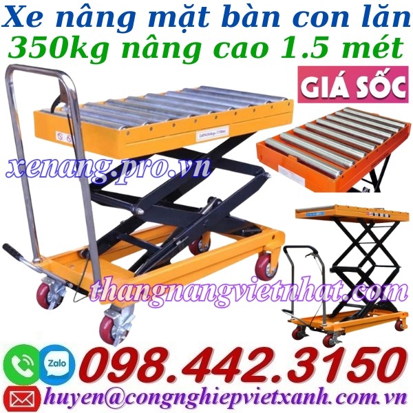 Xe nâng mặt bàn con lăn là một thiết bị hỗ trợ nâng hạ và di chuyển hàng hóa dễ dàng trong kho xưởng, nhà máy,...đặc biệt phù hợp với các dây chuyền sản xuất. Khác với các loại xe nâng mặt bàn thông thường loại xe nâng mặt bàn này được trang bị thêm hệ thống con lăn trên bề mặt bàn nâng giúp việc di chuyển hàng hóa nhanh chóng và nhẹ nhàng hơn. Đây là giải pháp hoàn hảo để nâng hạ các loại hàng hóa, máy móc, khuôn mẫu, cây cảnh, chậu cây kiểng…có khối lượng 350kg từ độ cao 1.5 mét. Xe nâng mặt bàn có con lăn giúp tiết kiệm sức lao động, giảm thiểu rủi ro và đảm bảo an toàn cho người sử dụng. Giá thành rẻ phù hợp tài chính khách hàng.
