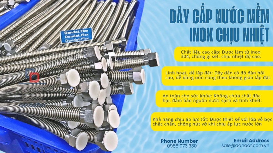 Dây cấp nước inox: Thường được sử dụng rộng rãi và phổ biến nhất hiện nay. Dây dẫn nước nóng lạnh là được làm từ chất liệu cao cấp, do đó nó có khả năng bảo vệ ống dẫn nước cực tốt. Ngăn ngừa được tình trạng bục vỡ và chống xoắn dây. Do đó, dây dẫn nước inox thường được lắp đặt ở những nơi khu vực có áp lực nước mạnh.